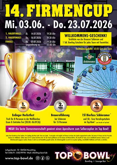 Wir freuen uns, den diesjährigen und bereits 14. Firmencup im Top-Bowl ankündigen zu dürfen. Los gehts am 03. Juni 2026!